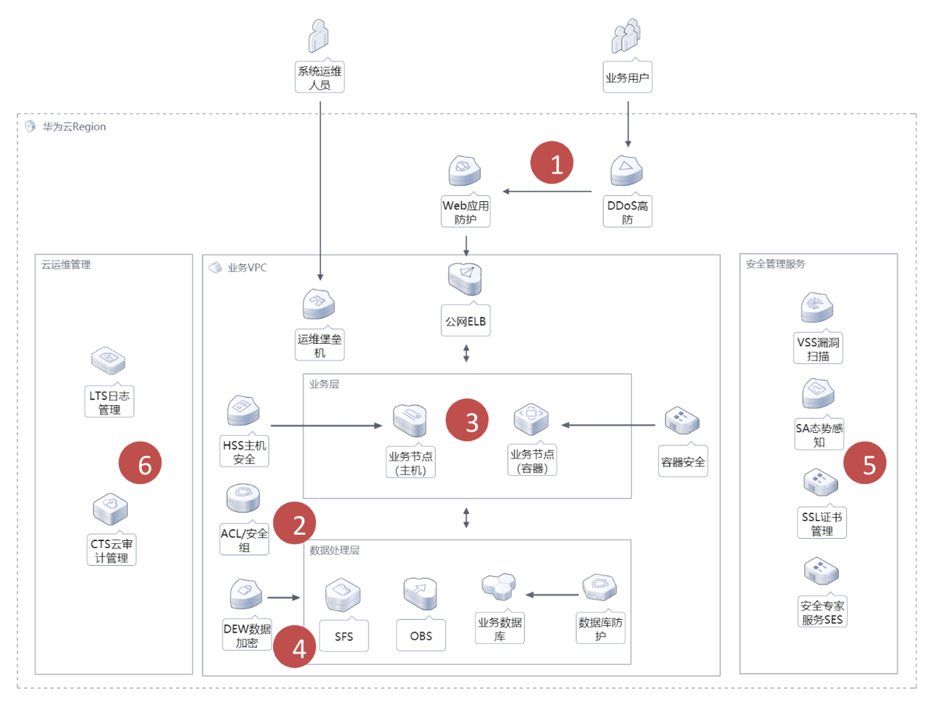 6.安全运维:CBH堡垒机提供安全运维环境。通过堡垒机做好分权分域的管理,建议开启堡垒机双因子认证,所有高危操怍〔例如rm操作)加审批权限控制;LTS配套云服务实例提供云上日志收集和统一管理;CTS云审计管理提供云上操作审计