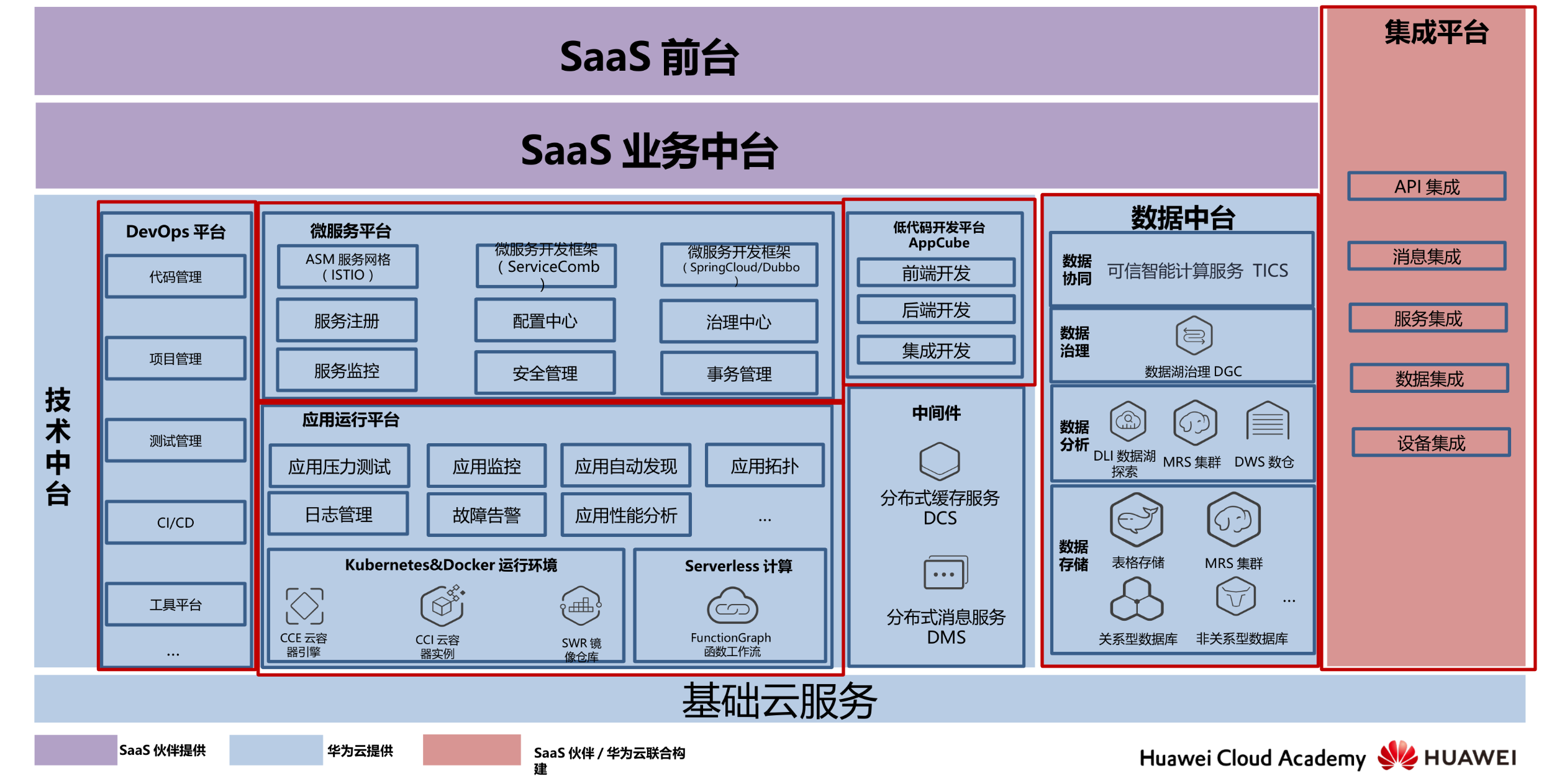 华为云提供技术中台、数据中台,帮助SaaS伙伴高效构建业务中台,并打通周边集成对接