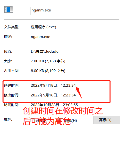 (6)查看文件时间,创建时间、修改时间、访问时间,黑客通过菜刀类工具改变的是修改时间。 所以如果修改时间在创建时间之前明显是可疑文件.