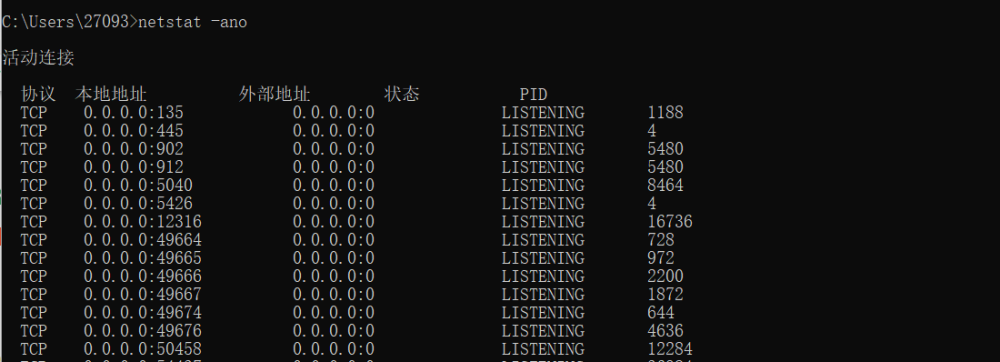 (1)netstat -ano 查看目前的网络连接,定位可疑的 ESTABLISHED netstat 显示网络连接、路由表和网络接口信息;