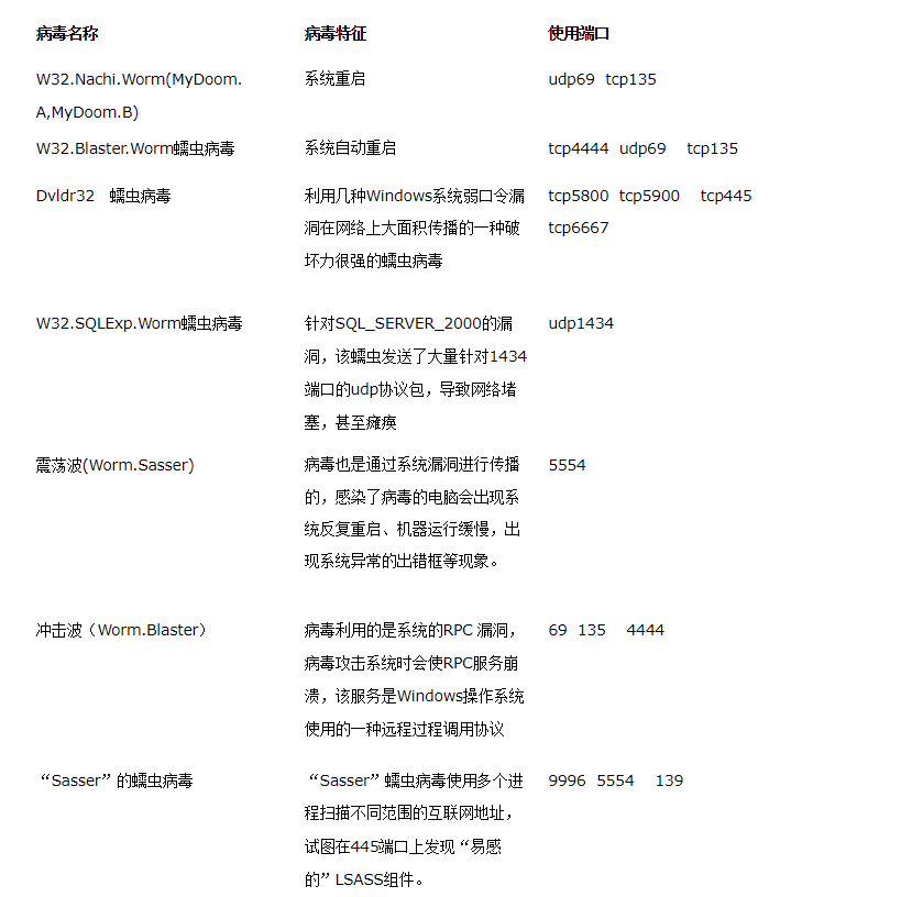 下面提供一些常用的病毒使用的端口信息,可以作为参考:
