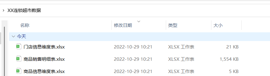 这里面有一个商品销售明细表,记录了商品销售的详细信息,还有两个维度表,一个是门店信息表,记录了门店所处省市、名称和编码,另一个是商品信息表,记录了商品的种类,名称和编码。