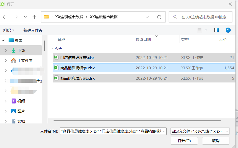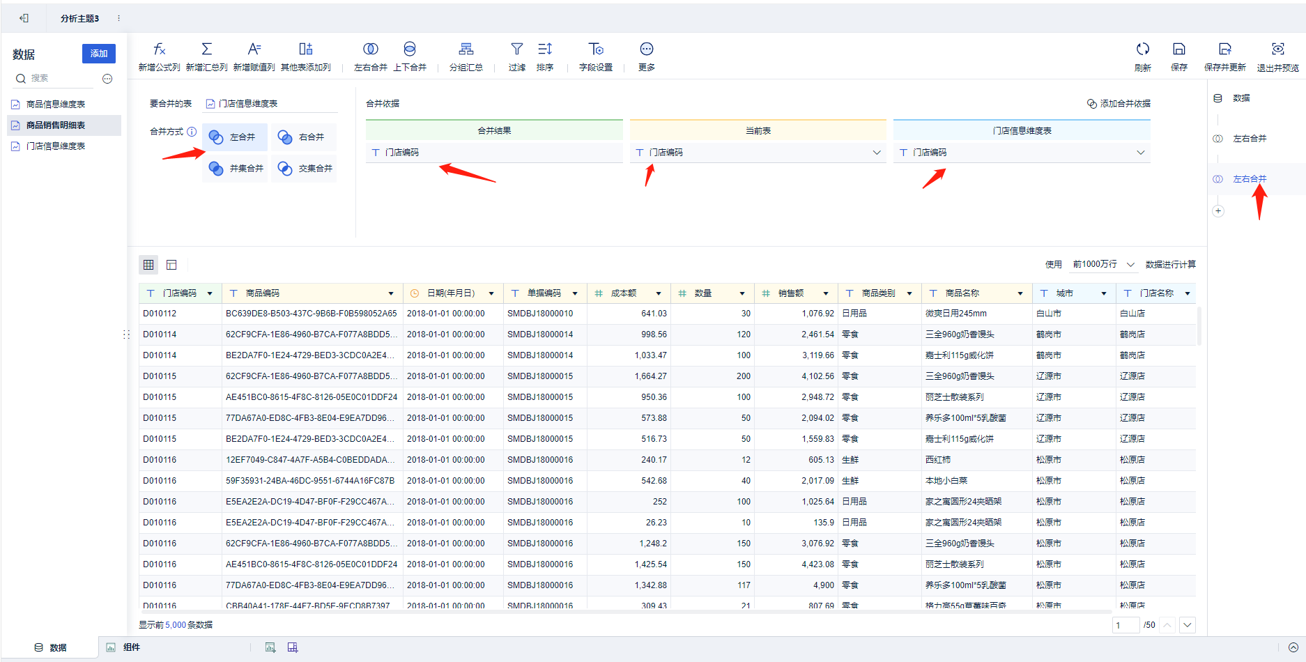 我们可以先将这三张表合成一张大宽表,让商品销售明细表的数据中也有商品的名称、种类信息,更有门店的省、市、名称信息。