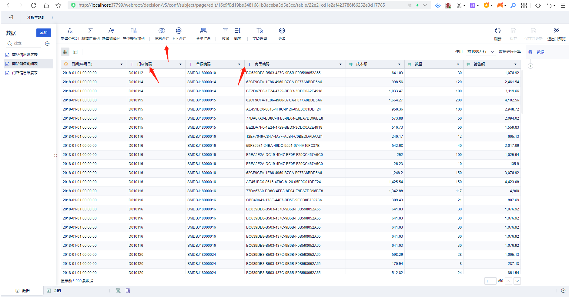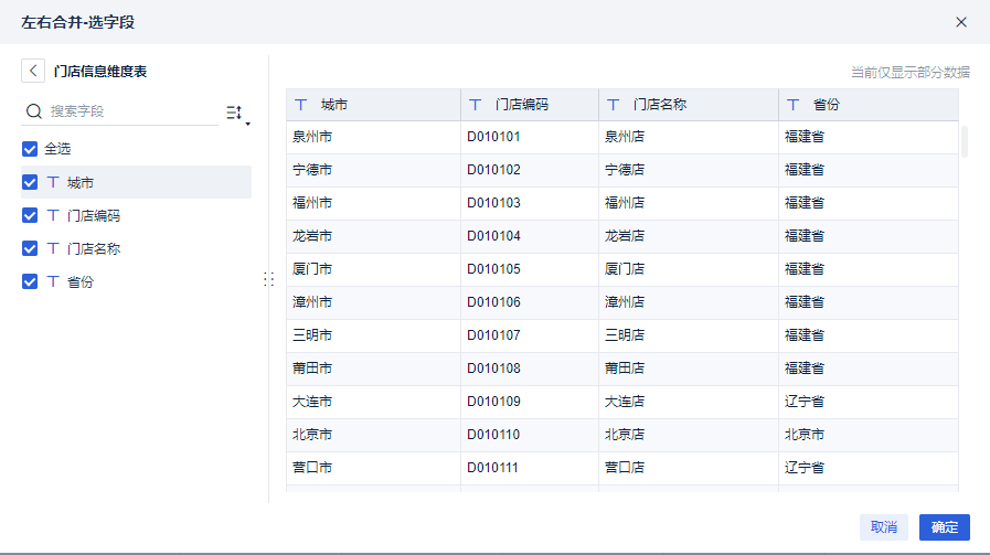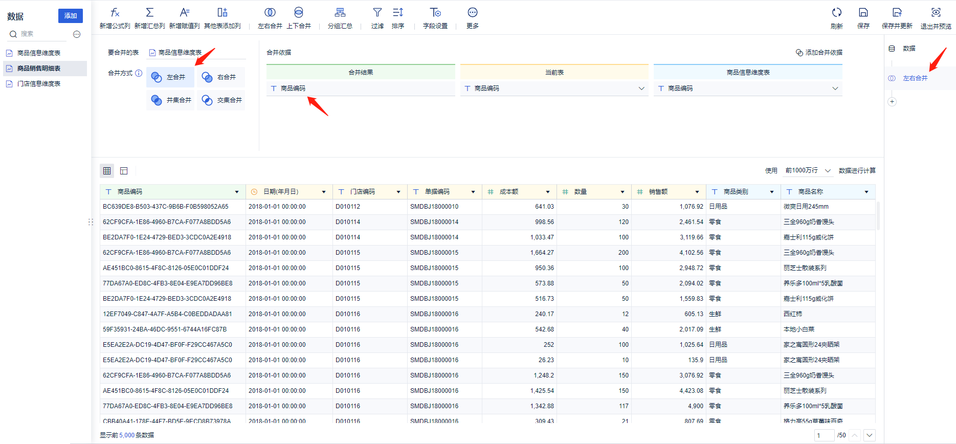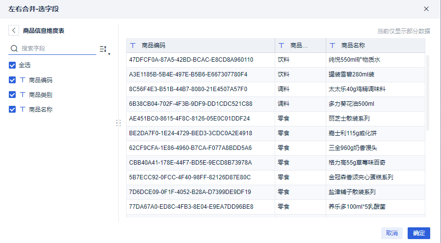 FineBI也可以根据表头的字段名称自动识别合并的关联字段,当然,用户也可以手工设置合并中的关联字段。