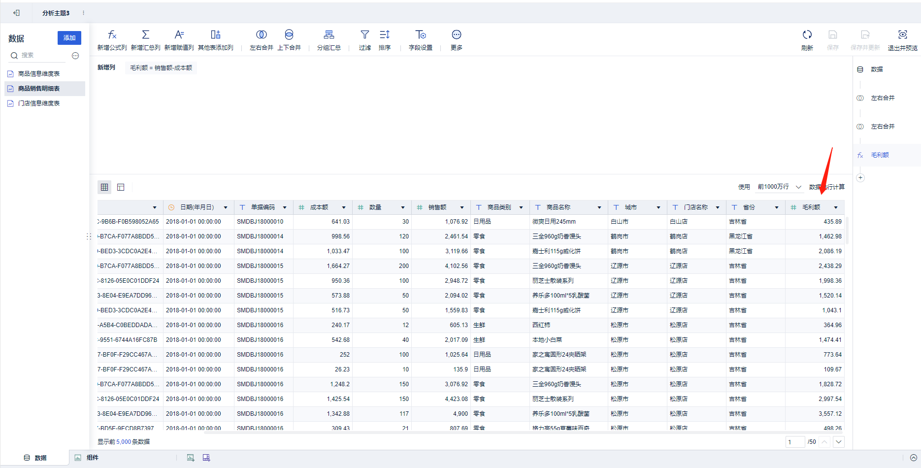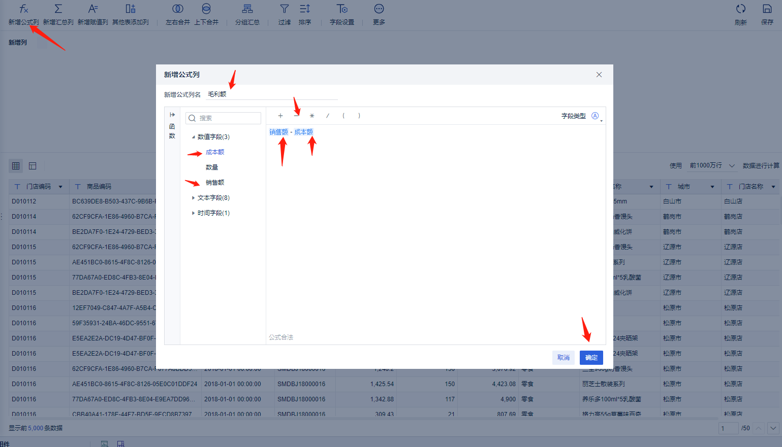 通过新增公式列,可以增加一个叫做 毛利额的字段。毛利额=销售额-成本。