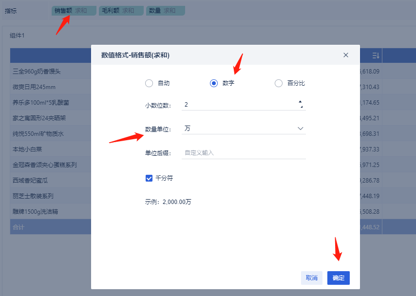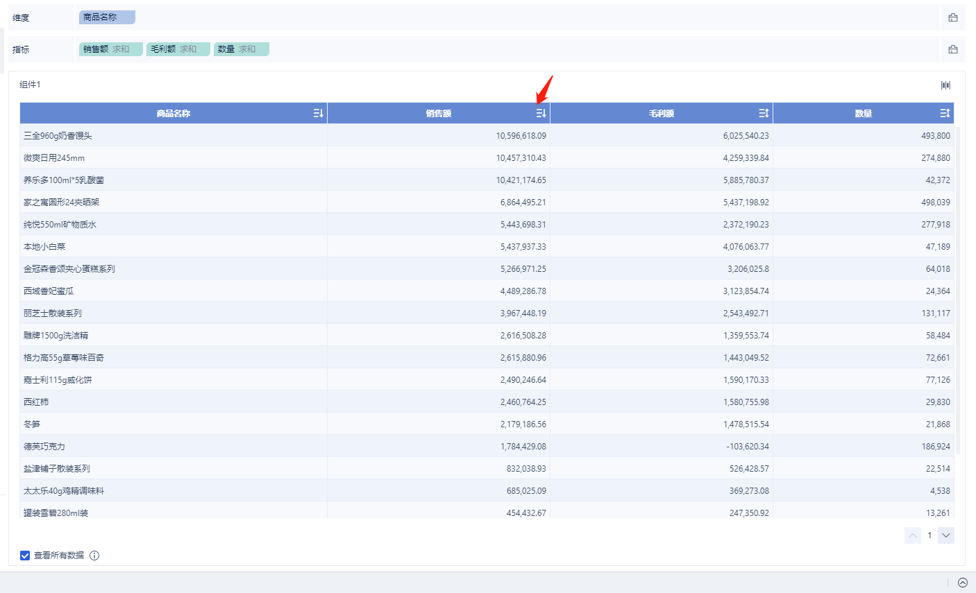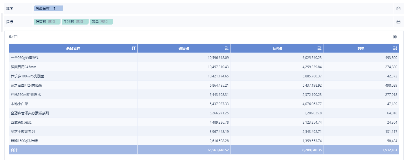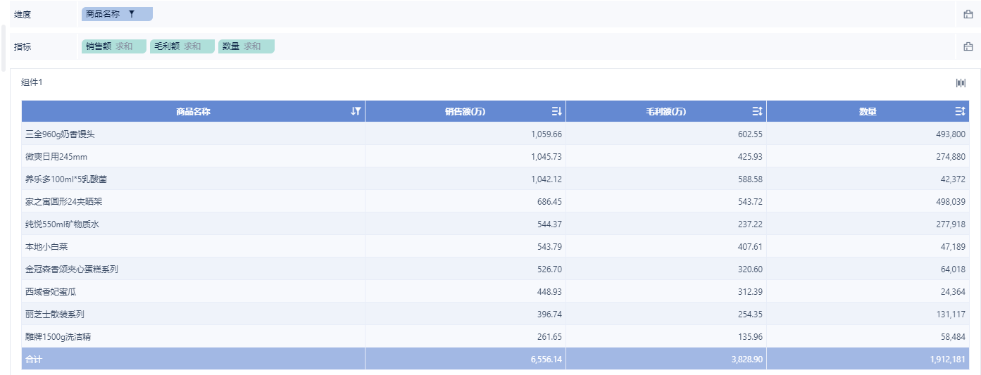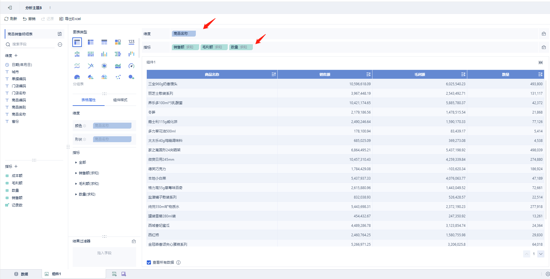 点击下面的添加组件按钮,在组件的sheet中,添加 商品名称 到维度栏,添加 销售额、毛利额、数量到指标栏