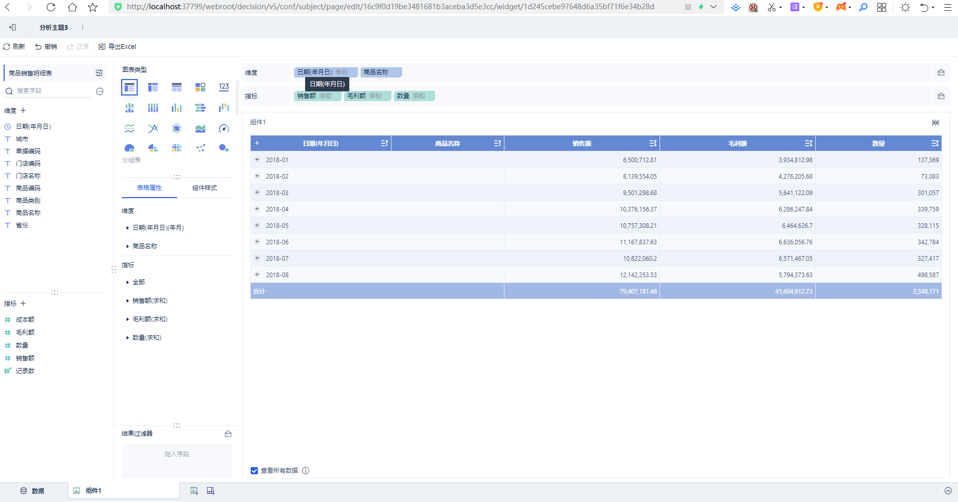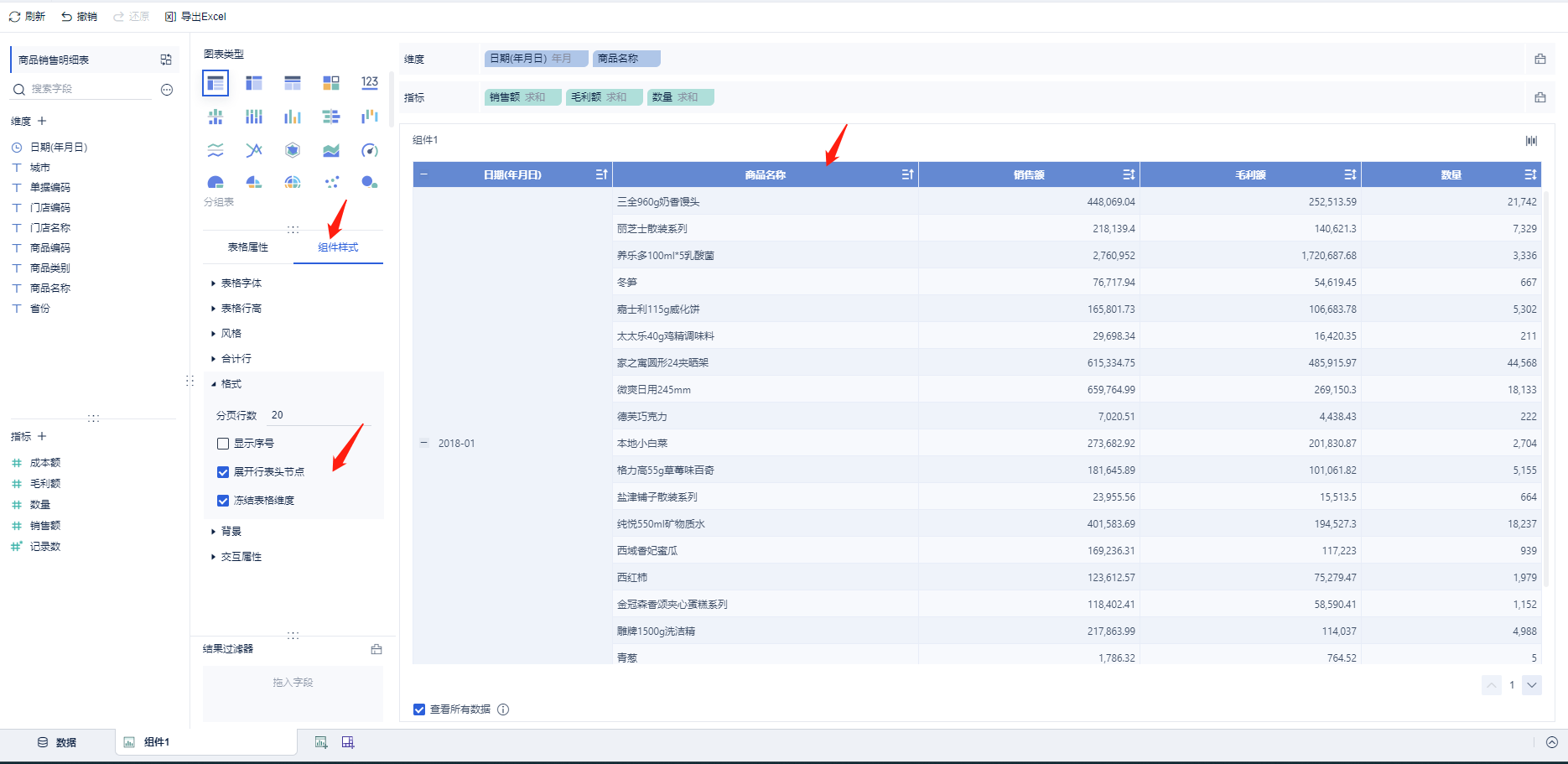 此时商品名称被折叠了。可以通过点击日期展开,或者在组件样式中选择 展开表头节点展开商品名称。