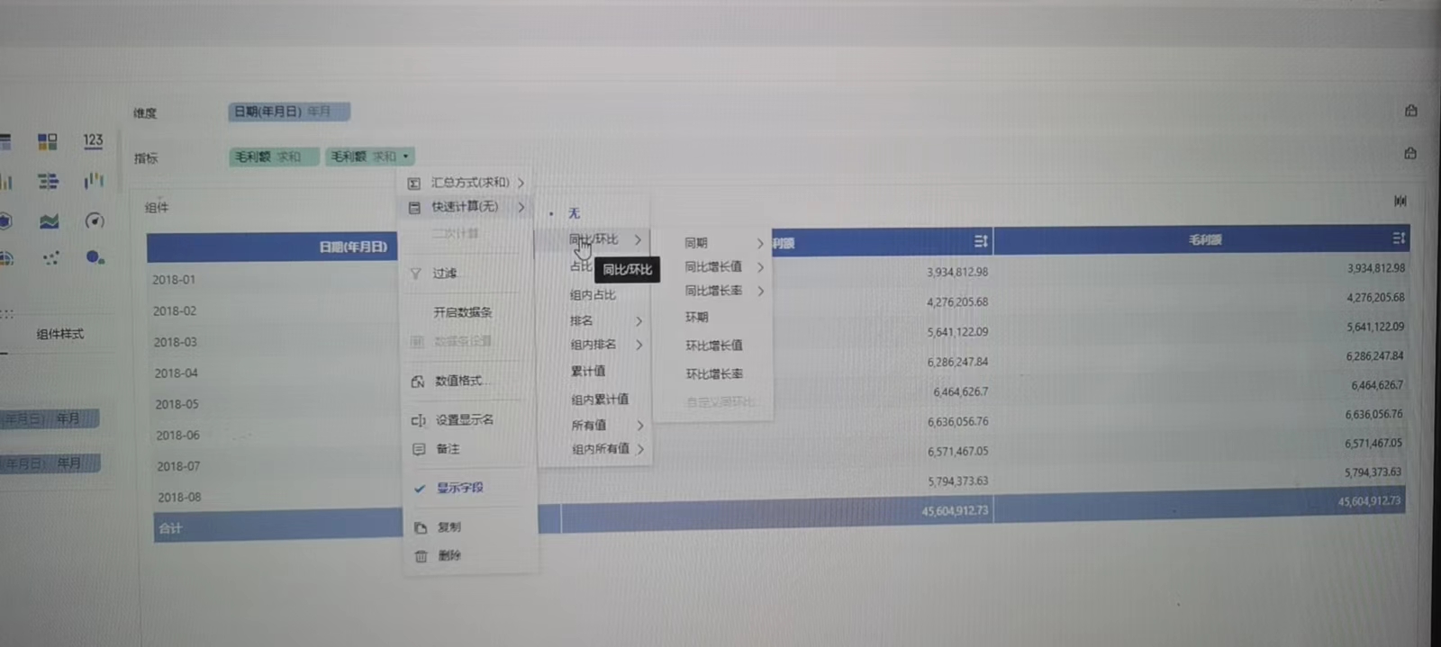 指标再加入一个毛利额,并将第二个毛利额按下拉菜单,按下图选择快速计算,选择同步/环比->环比增长率: