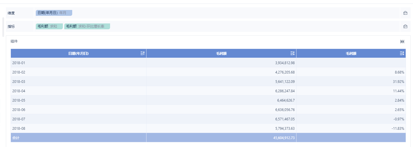 FineBI内置了对同比、环比、累计等的计算公式。故无需额外定义专门的列,也可以计算月毛利额环比增长率。