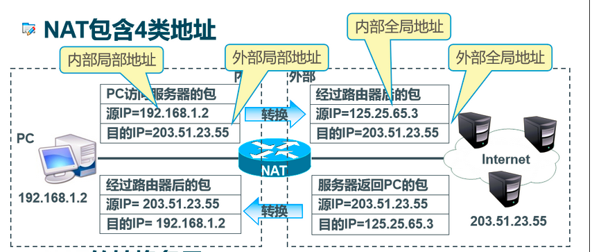 NAT可以让使用私有(保留)地址的网络与公网(互联网)连接。使用私有地址的“内部”网络通过NAT路由发送数据包时,私有地址被转换成合法的IP地址,因此,这些数据包可以发送到如互联网这样的公网上。