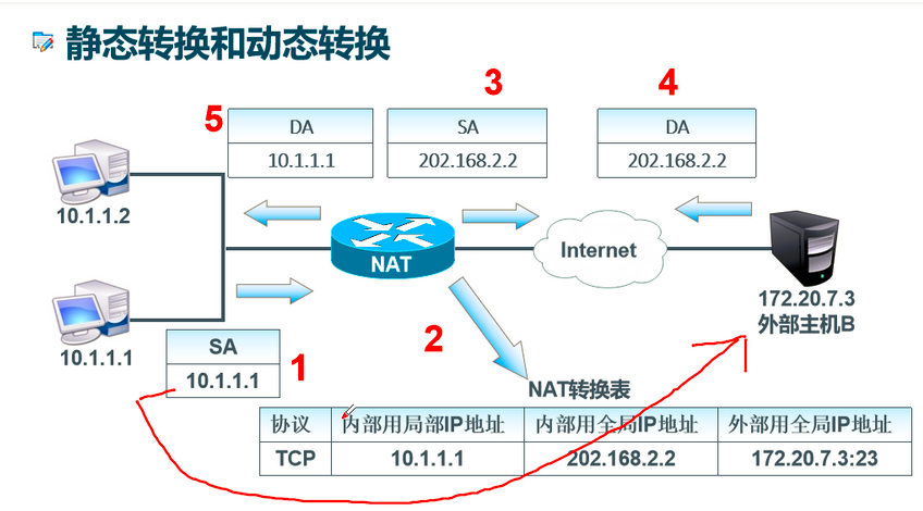 ⑤主机B收到该数据包,并且用目的的地址202.168.2.2对内部主机10.1.1.1进行应答。