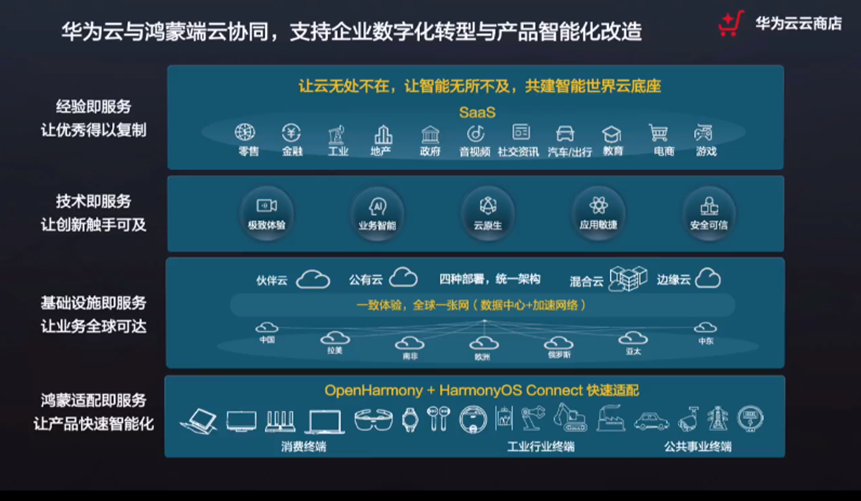 华为云与鸿蒙端云协同,支持企业数字化转型和产品智能化改造。通过华为云与鸿蒙协同,通过鸿蒙的适配即服务,可让企业产品快速智能化,通过华为云基础设施即服务,让企业业务全球可达;通过技术即服务,让企业创新触手可及,依托于华为云经验即服务,能让企业的优势得以快速复制,以利于企业的快速发展。