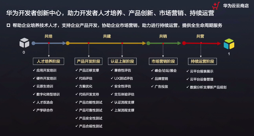 同时,华为开发者创新中心,也助力于开发者人力培训、产品创新、市场营销、持续运营。同时通过共培、共建、共销、共营等方式,帮助企业培训技术人力,支持企业产品开发、协助企业市场营销,助力企业进行持续运营,提供全生命周期服务。