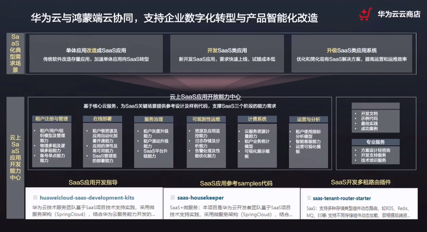 同时依托于华为云SaaS服务,企业可在华为云上根据需求快速搭建自己的相关服务,可保障企业服务的方便、快捷、安全、消费可视等特点,助力企业加速数字化转型。