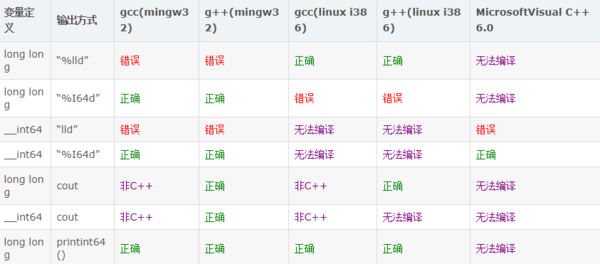 下面介绍的是五种常用的C/C++编译器对64位整型的支持,这五种编译器分别是gcc(mingw32),g++(mingw32),gcc(linux i386),g++(linux i386),Microsoft Visual C++ 6.0。可惜的是,没有一种定义和输出方式组合,同时兼容这五种编译器。 下面这个图是针对常见的编译器进行测试。
