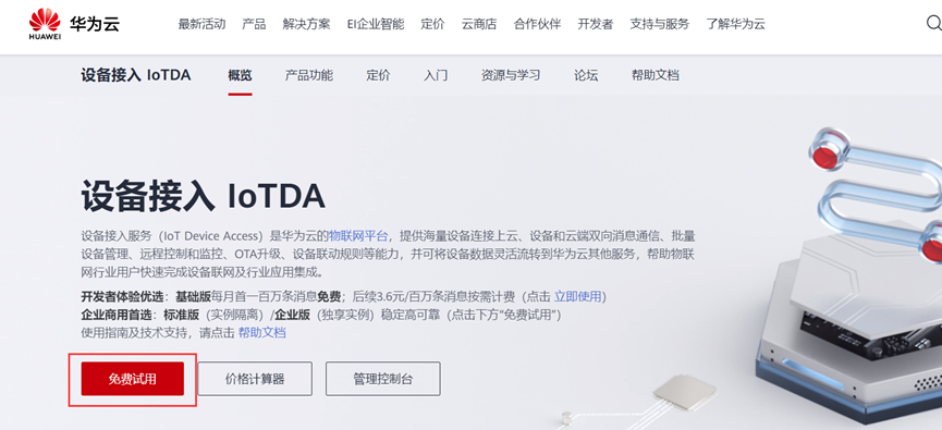 - 首先进入华为云IoT平台,访问设备接入服务,单击“管理控制台”进入“设备接入”控制台。