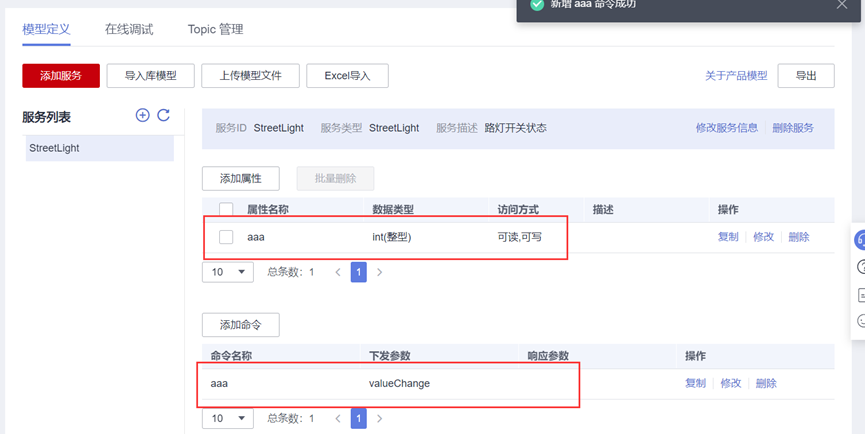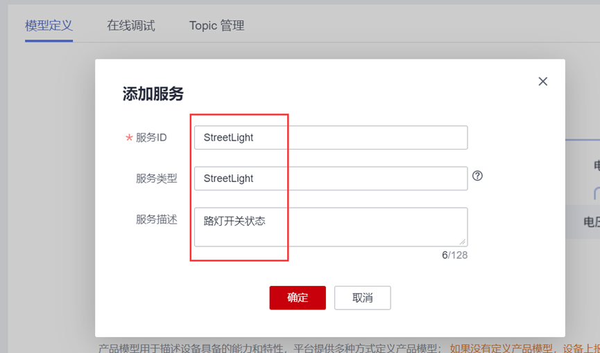 - 在产品详情模型定义页面,单击“自定义模型”,添加服务。