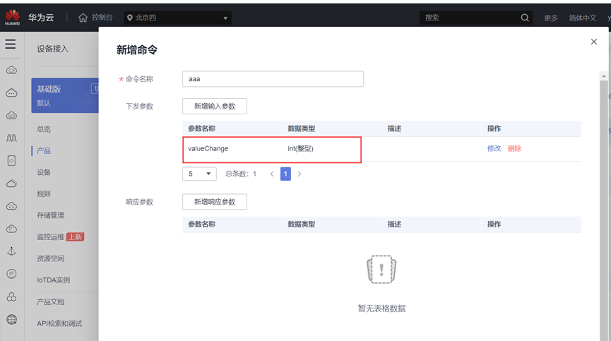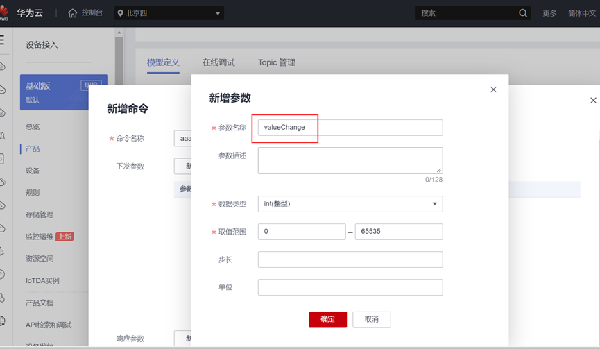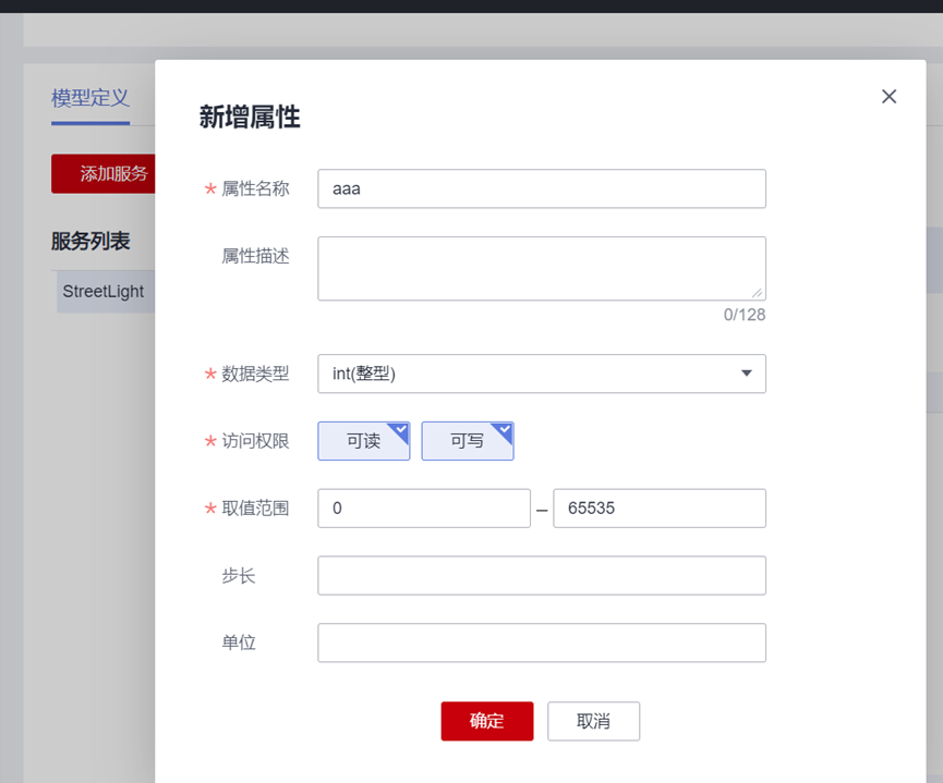单击新增的服务ID,在展开的页面单击单击“新增属性”,在弹出窗口中配置属性的各项参数,然后单击“确定”。