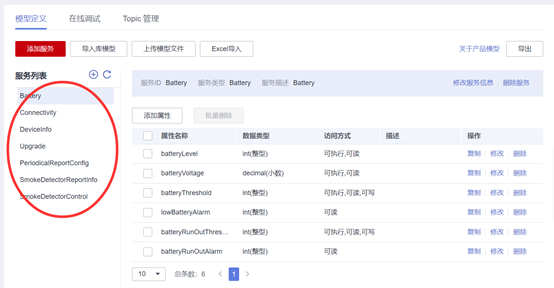在产品详情页里,可以通过切换“服务列表”中的不同服务,查看每个服务中包含的属性参数,平台还支持根据实际需求修改相应参数。至此,您已完成产品的定义。点击“在线调试”进入下一步。