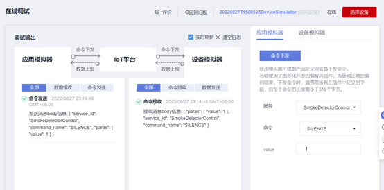 选择调试,尝试在应用模拟器中,模拟应用端向烟感设备下发命令,在valua中输入“1”,点击发送,可以在调试输出页面看到应用与设备之间通信的过程。