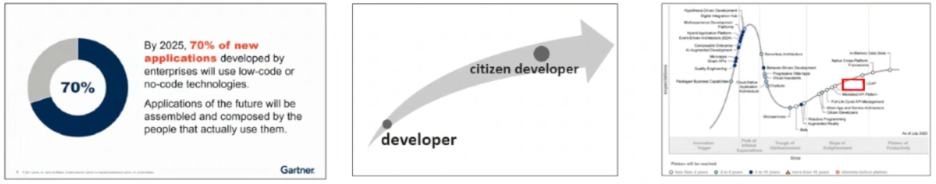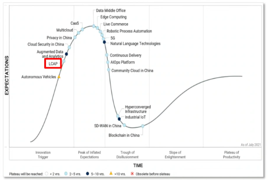 Gartner 显示国内低代码尚处于创新期,业务需求增加与开发者成本上升加速了低代码的布局。