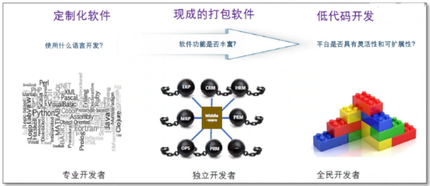 数字化转型驱动开发范式向低代码进化。最开始,开发是根据需求通过源代码的方式进行开发,而且定制化需求很多,后来演进为打包软件的方式开发,现在演进为使用低代码的方式进行开发。