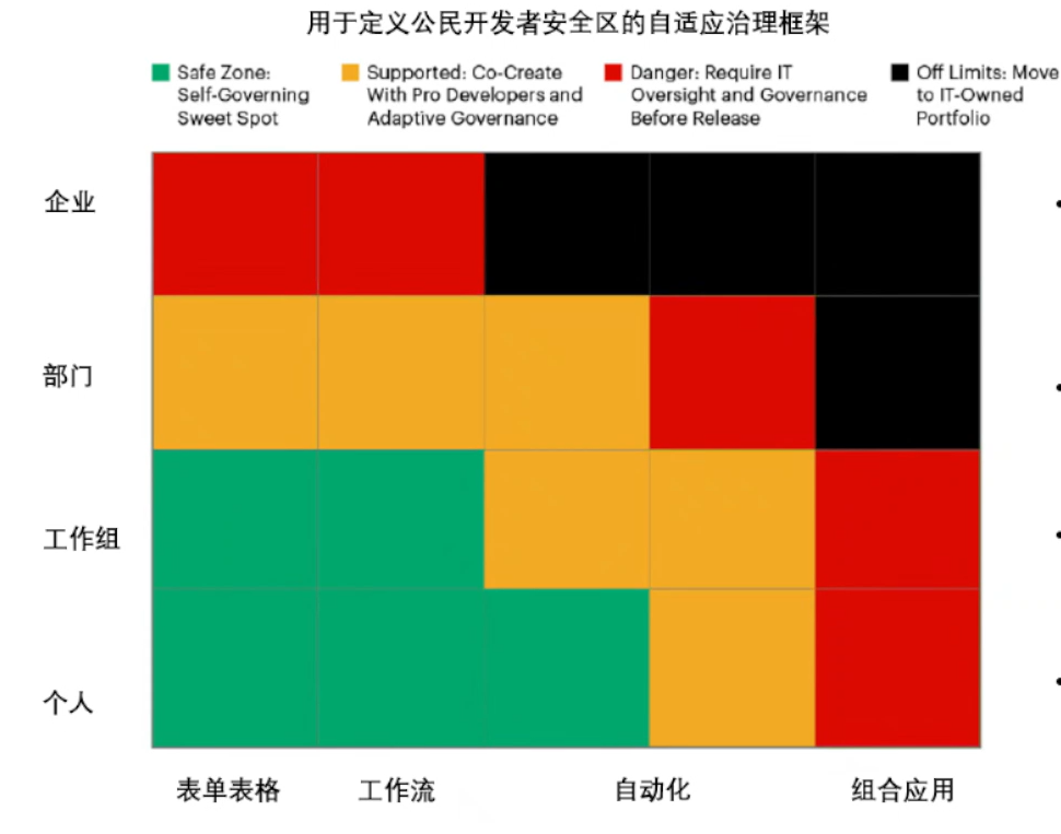 - 红色危险区:业务部和IT部共同构建,但发布前需要IT部进行监督和治理,执行严格的IT审查和发布流程。