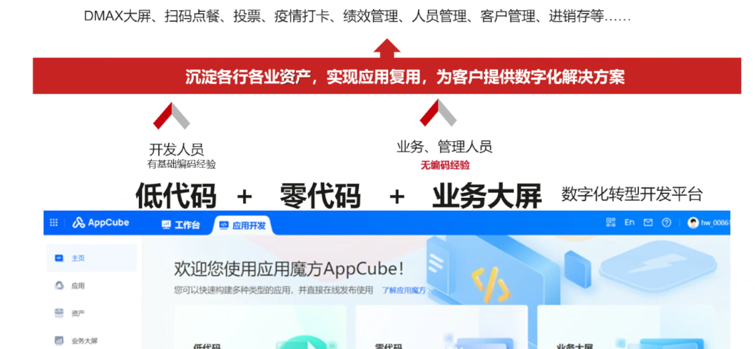 AppCube 的发展路径是由低代码丰富资产和丰富组件,然后在此基础上无代码通过丰富的组件进行不同的组合构建不同的应用,业务再根据实际的场景可以配置不同的数据大屏显示数据。