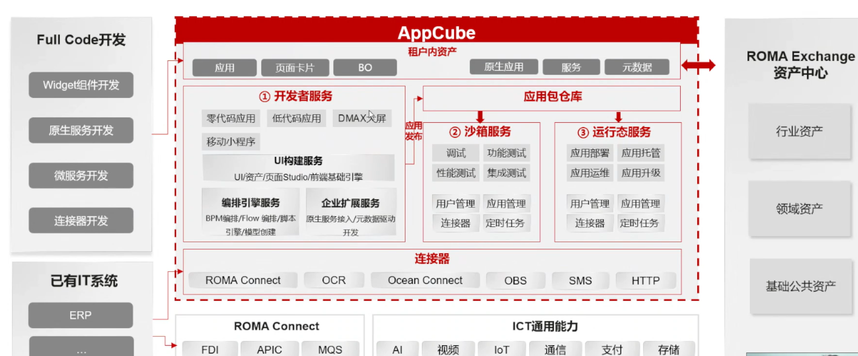 AppCube 提供了与ROMA Exchange资产中心的资产共享机制,开发完成的一些模板和组件发布之后,可以供我们自己的开发者使用,达到复用的目的,避免重复开发。