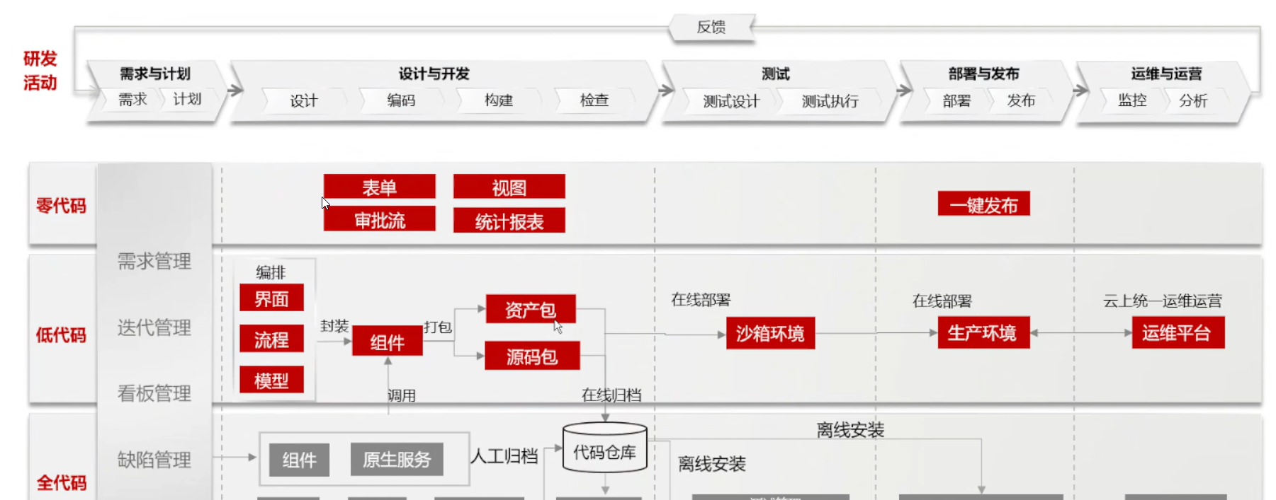 低代码开发的一些界面、流程和模型封装成组件,再打包成资产包,先发布到测试环境,运行稳定再发布到生产环境,最后由云上的统一运维运营平台进行管理。组件也可以打包成源代码包进行在线归档,存放到代码仓库中,这时候就可以通过源代码进行全代码的部署,部署到不同的环境中。低代码的就更加简单,可以对编排好的服务进行一键式发布。