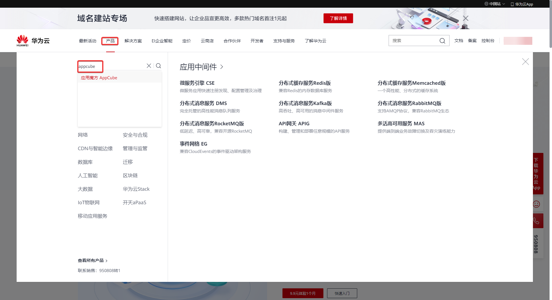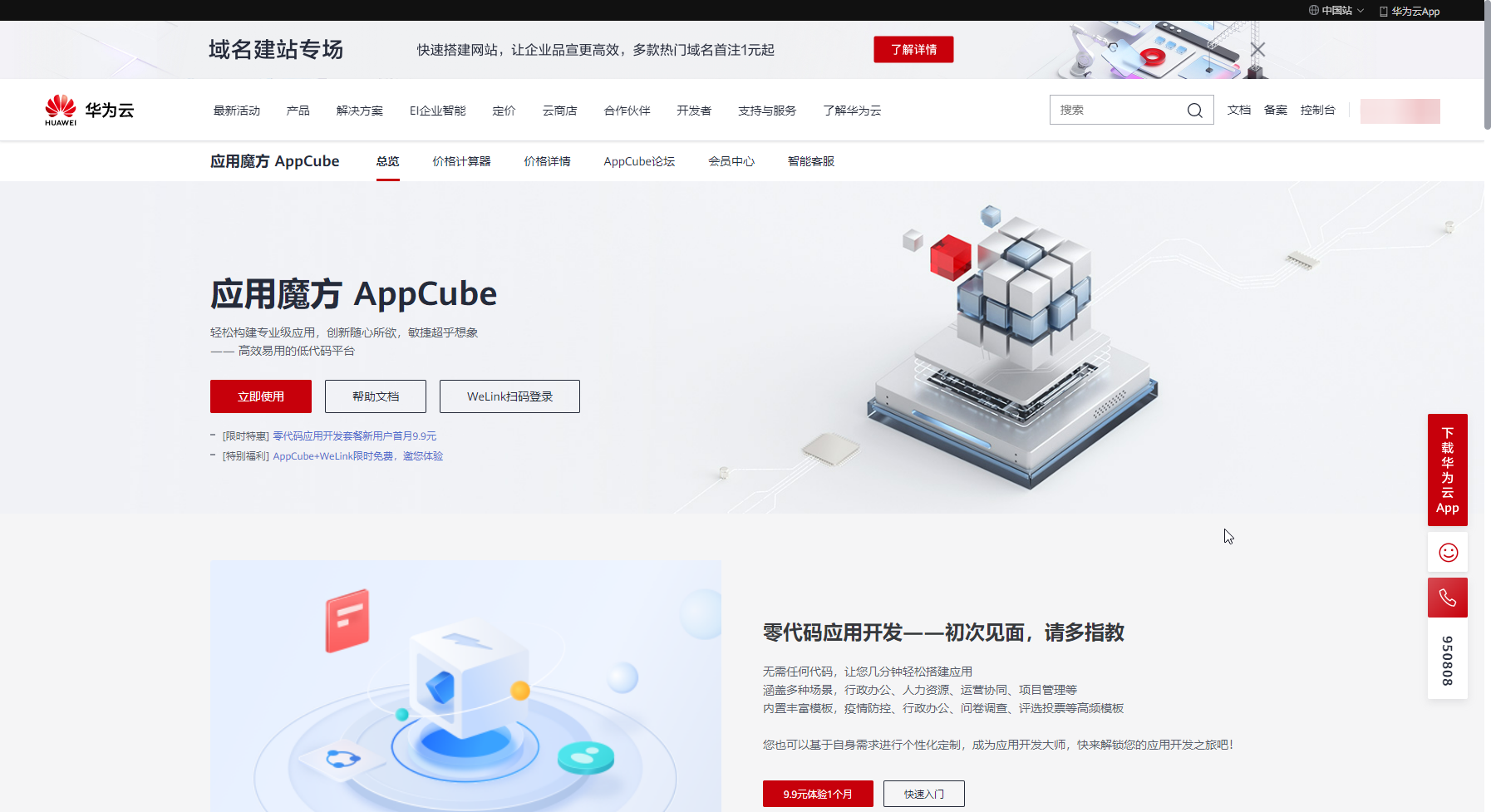 通过华为云官网,在“产品“下面搜索”appcube“选择” 应用魔方 AppCube “。
