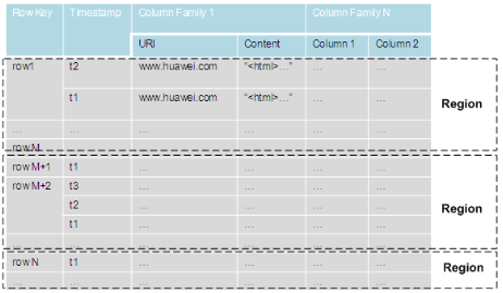HBase以表的形式存储数据,数据模型如图所示。表中的数据划分为多个Region,并由Master分配给对应的RegionServer进行管理。