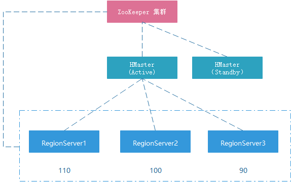 其中RegionServer1 有110个Region,RegionServer2 有100个Region,RegionServer3 有90个Region;