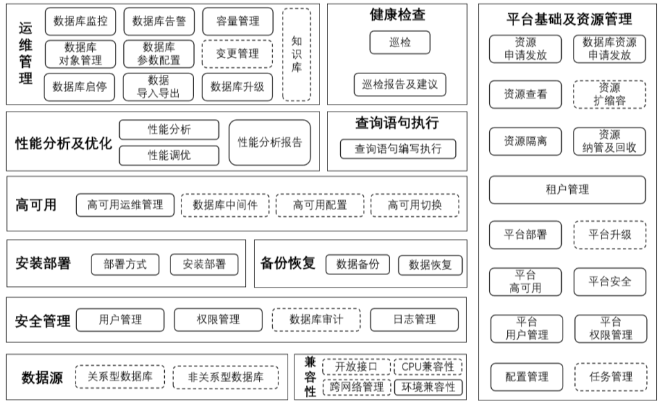 数据库平台的管理(运维)包括但不限于:系统部署、资源分配与回收、日常监控、主备切换、增减备库、实例与数据迁移、备份与恢复、故障与异常排查诊断、性能分析、安全控制、变更发布、数据管理等。其每一点都可以展开来研究,本文不做详细介绍,仅供大家拓展思路。