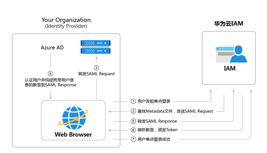 华为云支持基于浏览器的页面单点登录(WebSSO)和非浏览器的调用API接口访问两种方式的联邦身份认证。本文以Azure AD为企业IdP,示例配置联邦认证,使Azure AD用户通过单点登录访问华为云控制台(WebSSO),如需了解通过调用API接口访问华为云,请参见:API参考>联邦身份认证管理。