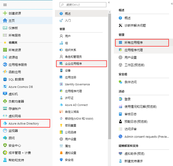 - 在Azure首页左上角导航栏选择“Azure Active Directory > 企业应用程序 > 所有应用程序”。