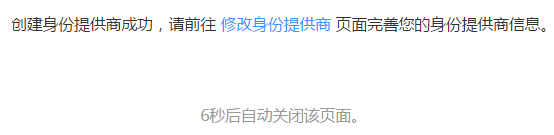 - 单击“确定”。创建身份提供商成功,界面提示如下图所示: