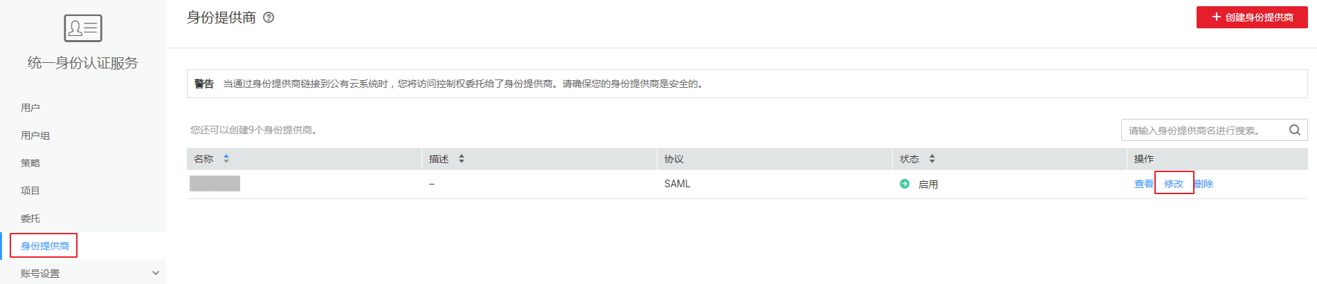 - 配置身份提供商信息。单击身份提供商中“操作”列的“修改”。