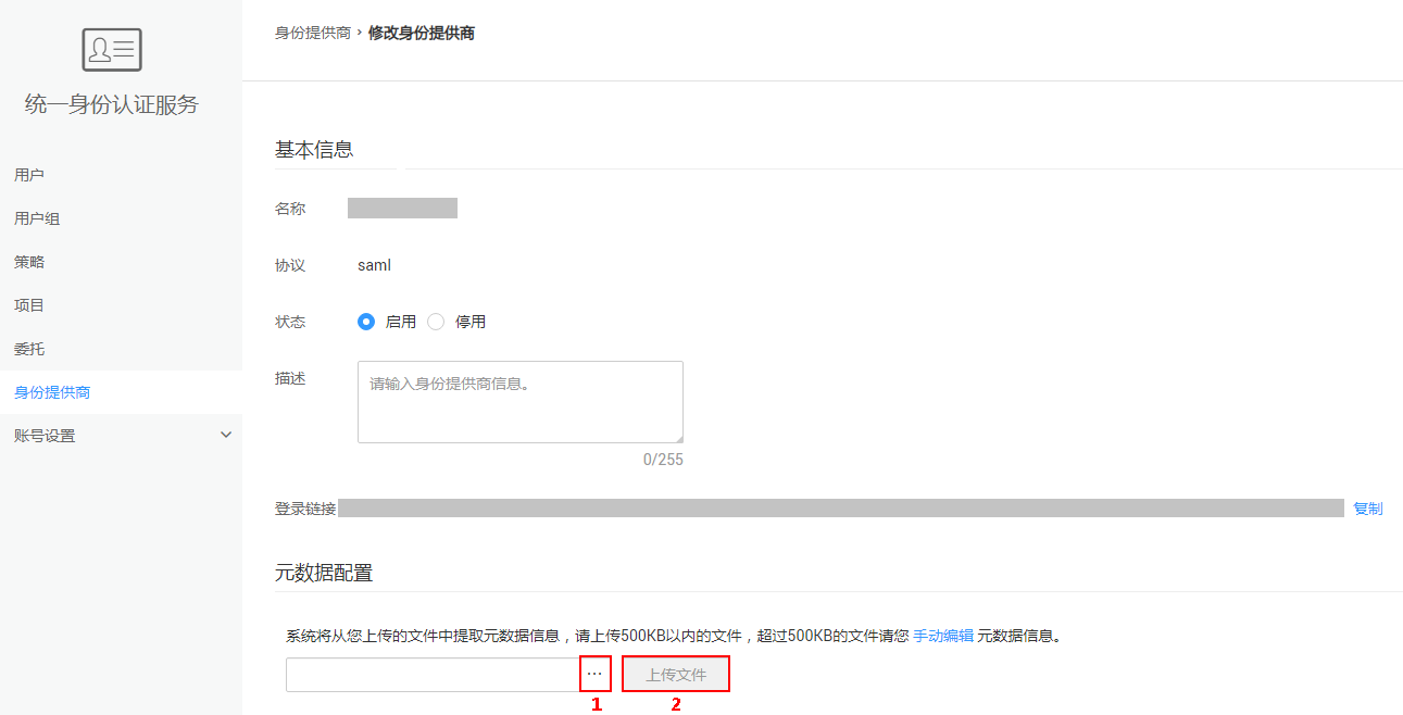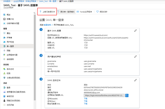 - 单击“上载元数据文件”,配置华为云元数据文件。