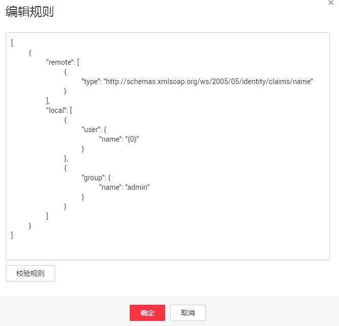 单击“编辑规则”,将以下规则拷贝至规则框内,表示将Azure AD的name映射到华为云本地name,归属于admin的用户组,拥有admin组的权限。