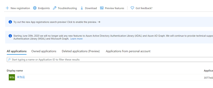 - 进入到您的AD租户实例面板,选择“APP registration”,注册应用。