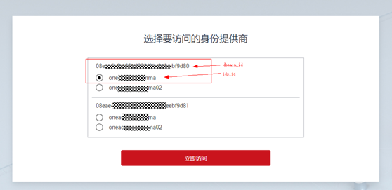 - 拷贝User access URL至浏览器执行。输入您可以访问该应用程序的AD用户密码后,将自动跳转到华为云如下界面,根据您在声明配置中所配置的帐号信息,会呈现一个帐号选择列表,选择你想要访问的帐号对应身份提供商,即可进入华为云。