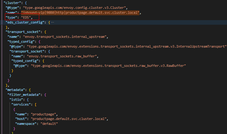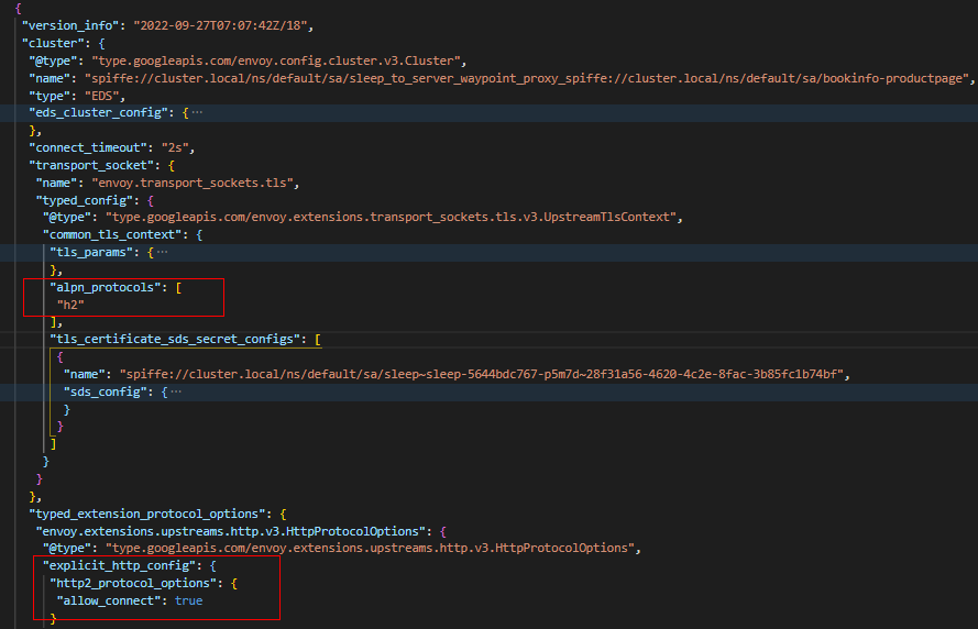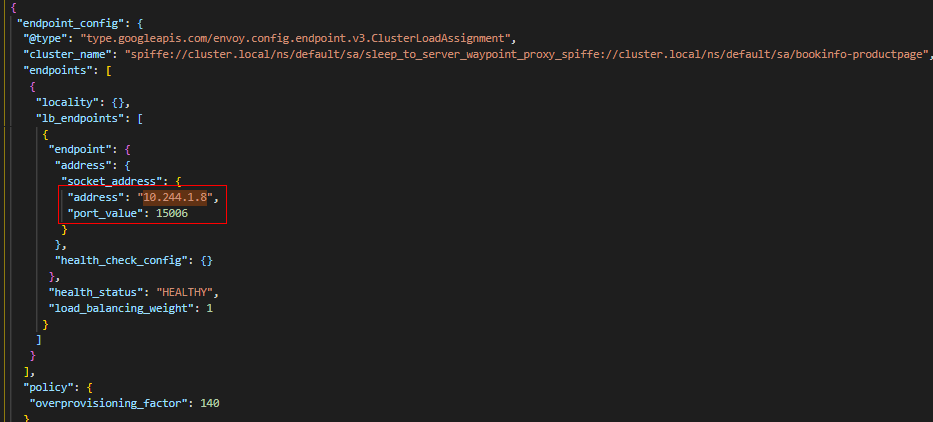 (4) "spiffe://cluster.local/ns/default/sa/sleep_to_server_waypoint_proxy_spiffe://cluster.local/ns/default/sa/bookinfo-productpage" Cluster为EDS类型,包含的Endpoint地址为10.244.1.8:15006,即waypoint容器的监听地址。后面我们可以看到waypoint中有监听器监听在15006端口。此Cluster负责将流量进行加密,然后发送到waypoint(10.244.1.8:15006)。