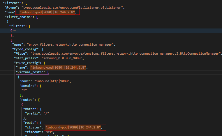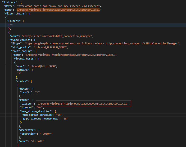 (3) Vip监听器非常重要,一些服务治理策略,比如VirtualService设置的路由策略都在此监听器中加载,这里我们没有配置任何的策略,因此它主要是通过"inbound-vip|9080|http|productpage.default.svc.cluster.local" Cluster进行负载均衡,将将流量转发到Pod监听器处理。