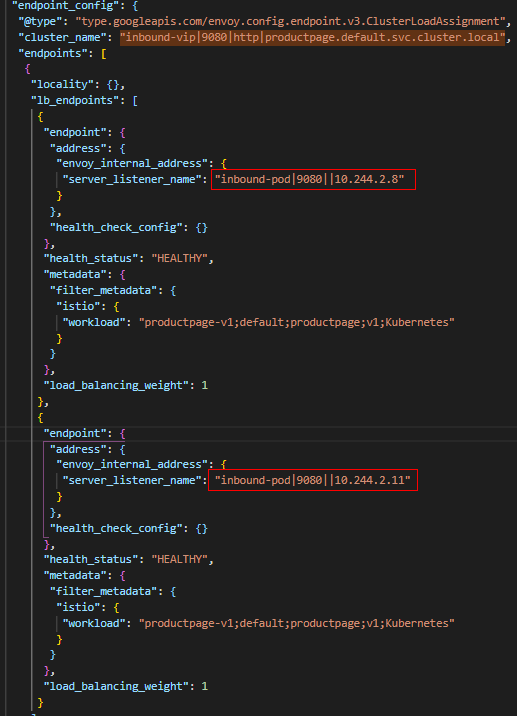 在本例中,我们启动了两个Productpage服务实例,假设经过"inbound-vip|9080|http|productpage.default.svc.cluster.local" Cluster负载均衡后,流量被转发到10.244.2.8这个Pod监听器。那么流量进而被关联的"inbound-pod|9080||10.244.2.8" Cluster接管。