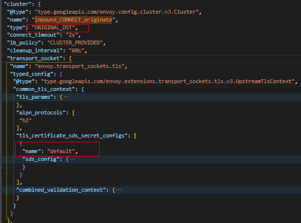 (7) ” inbound_CONNECT_originate” Cluster为ORIGINAL_DST类型,并且设置有TLS Context。因此最后经过TLS加密后,数据包最终被发往10.244.2.8:15008。