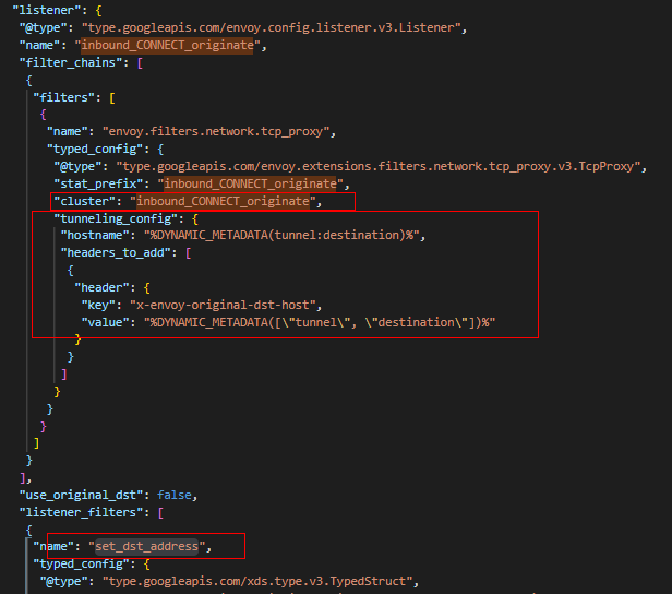 (6) ”inbound_CONNECT_originate”监听器是waypoint处理流程中的最后一个过滤器,它会通过HTTP Connect方法告诉目标ztunnel建立到"%DYNAMIC_METADATA(tunnel:destination)%的隧道,这里CONNECT地址即10.244.2.8:9080。并且通过“set_dst_address”将数据包的目的地址设置为10.244.2.8:15008。