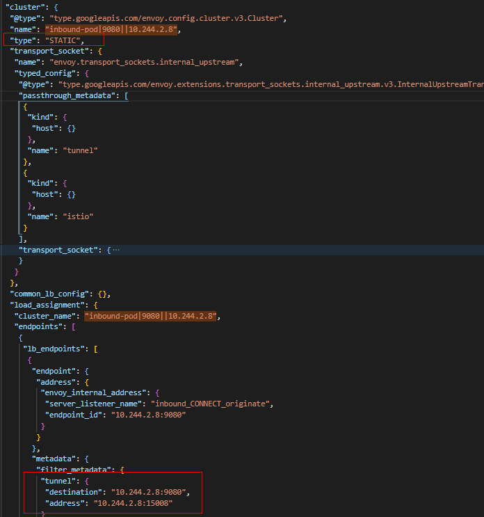 (5) "inbound-pod|9080||10.244.2.8" 是一个静态的Cluster,其主要设置建立CONNECT 相关的metadata,然后将流量转发给” inbound_CONNECT_originate”监听器
