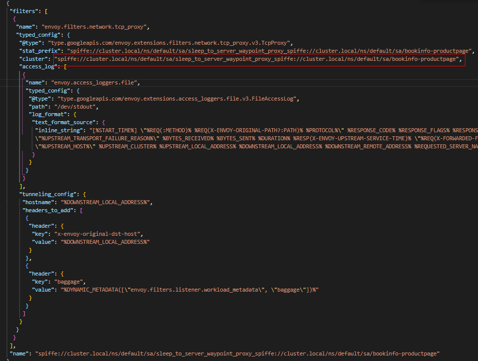 (3) "spiffe://cluster.local/ns/default/sa/sleep_to_server_waypoint_proxy_spiffe://cluster.local/ns/default/sa/bookinfo-productpage" FilterChain,包含一个TCPProxy过滤器,并且关联到与FilterChain同名的Cluster。即访问请求交由同名的 Cluster处理