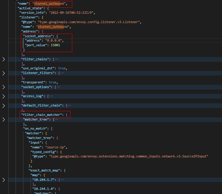 (2) ztunnel通过ztunnel_outbound监听器,监听在15001端口。ztunnel_outbound监听器与Istio Sidecar模式的监听器完全不同,它包含所有本节点上的服务到整个网格其他服务的FilterChain(过滤器链)。